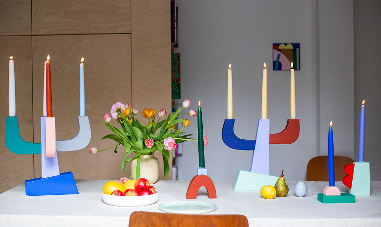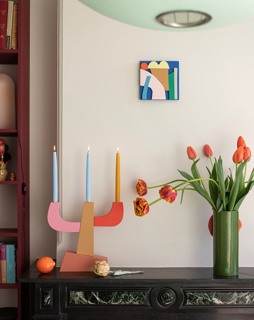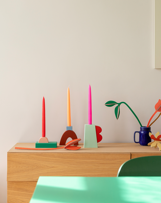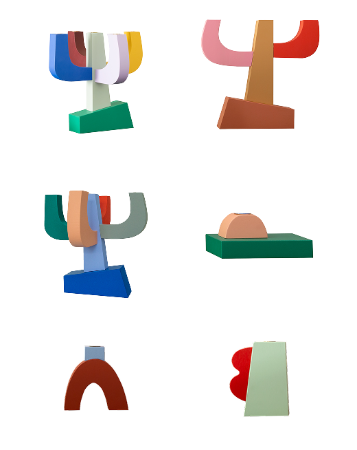 A collection of solid wooden blocks that seem to be balancing on an asymmetrical pedestal. Playful designs that subtly allude to the Memphis movement. Each piece is made to order in our Amsterdam atelier, hand-painted and assembled using FSC-certified birch plywood and water-based paints.