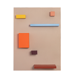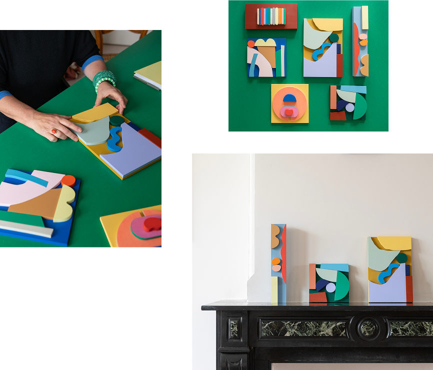 The starting point was leftover wood from our atelier. By carefully combining these basic elements and applying distinctive colour combinations, we created one-of-a-kind wall art pieces, sold in our Amsterdam store.