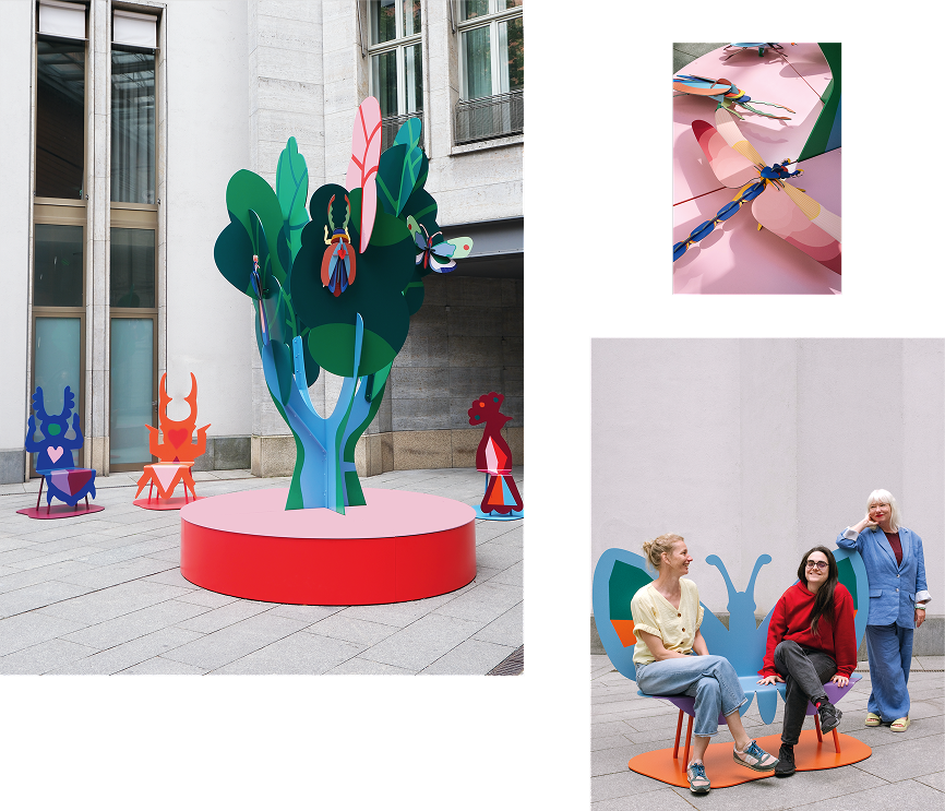 Around it, butterfly- and insect-shaped seating invited visitors to pause, while lanterns displayed oversized versions of our signature flowers. The installation remained in place until March 2025.